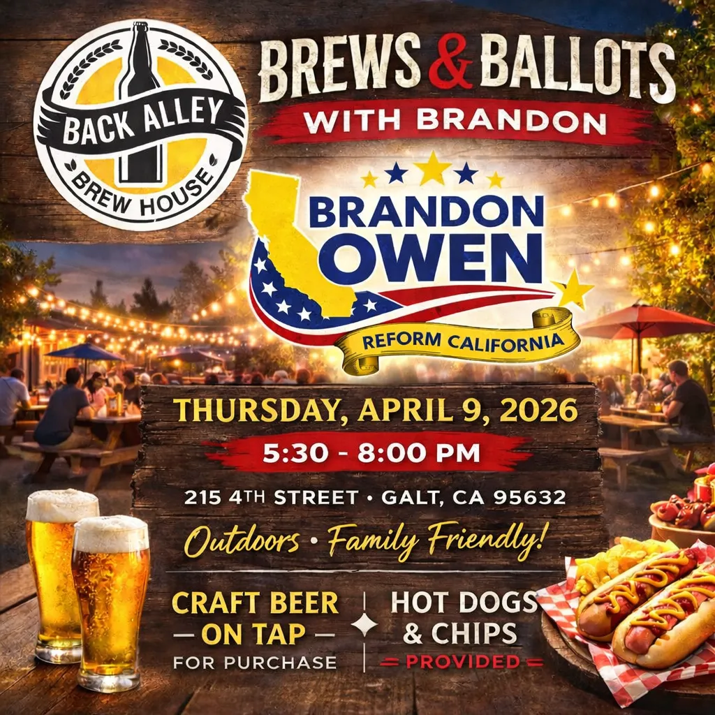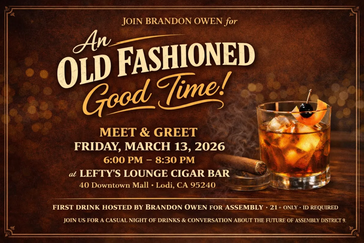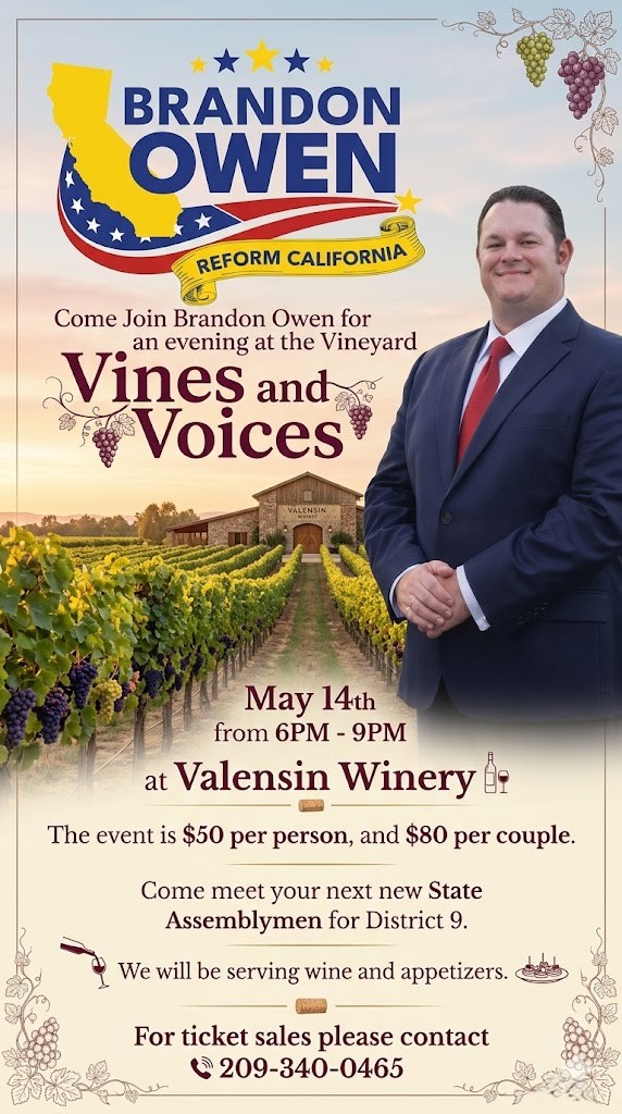 Vines and Voices is an evening of conversation, community, and connection at the beautiful Valensin Winery. Join us for a relaxed and welcoming event where guests can enjoy wine, appetizers, and the opportunity to meet a candidate who is committed to bringing strong leadership and real representation to District 9. This event is designed to bring people together in a local setting to talk about the issues that matter most to our communities, our families, and the future of California. Whether you want to learn more about Brandon’s vision, share your concerns, or simply enjoy a great evening with friends, this will be a memorable night at the vineyard.